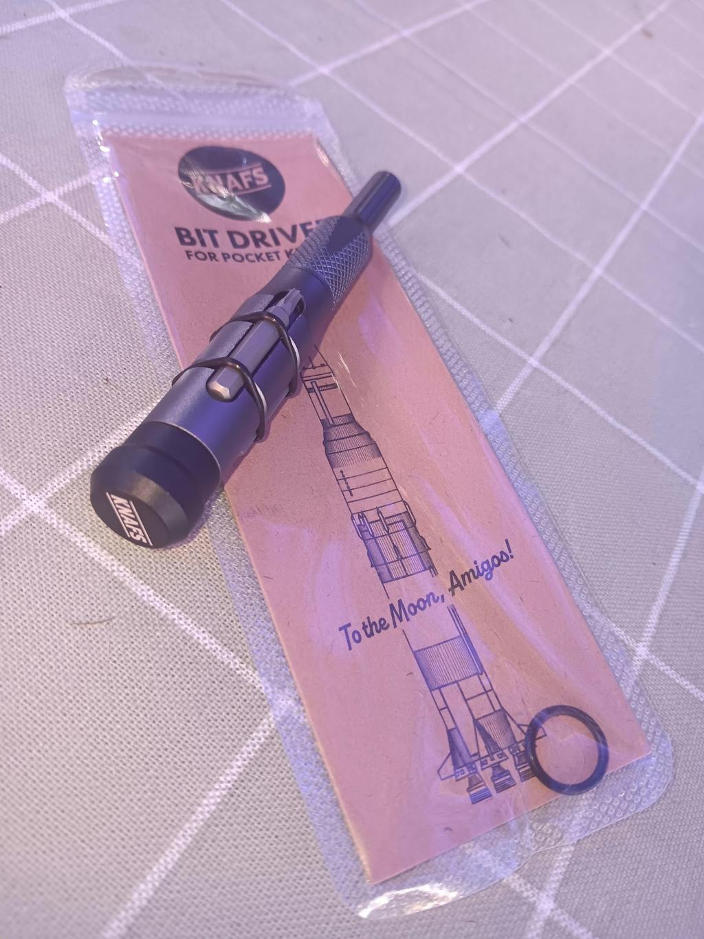 This pocket knife Torx Driver has Wiha bits that are stored in magnetic channels on the outside of the tool for quick access. This driver utilises o-rings as seatbelts to keep the bits in place for fidgeting, travel, and blast off. The end cap is aluminum with an internal bearing for clean control while using. Jimping and knurling is all over this thing for grip. Knafs pulled styling cues from the Saturn V Rocket and designed this tool to be blast-off ready. To the Moon, Amigos!