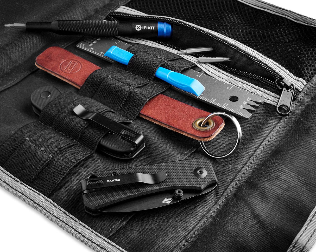 I spent 10 years keeping all of my knife maintenance tools in a zip top, plastic bag. Functional, sure. Ugly, decidedly. Additionally, I have a habit of disassembling knives on my lap while sitting on the couch. The scale screws and pivots typically nestle somewhere in my shirt before launching themselves to freedom in the carpet. The Tool Burrito solves both problems: it's a rugged, well designed pouch for your tools, yet it also functions as a mobile workspace that magnets your screws in place until you re-assemble your knives. It's a tear-down mat that doesn't commandeer your counter space. - Ben