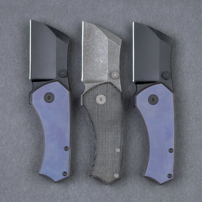 - Your choice of black micarta with a dark stonewashed blade, blurple anodized with a black pvd coated blade, or blurple titanium with mokuti accents