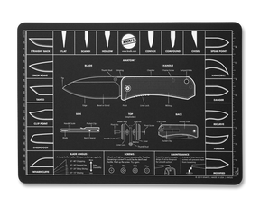 The maintenance mat features a prominent folding knife in the middle with handy references to knife anatomy: pivot, liner lock, washers, etc. The sides of the mat feature blade shapes and knife grinds commonly used on many knives.