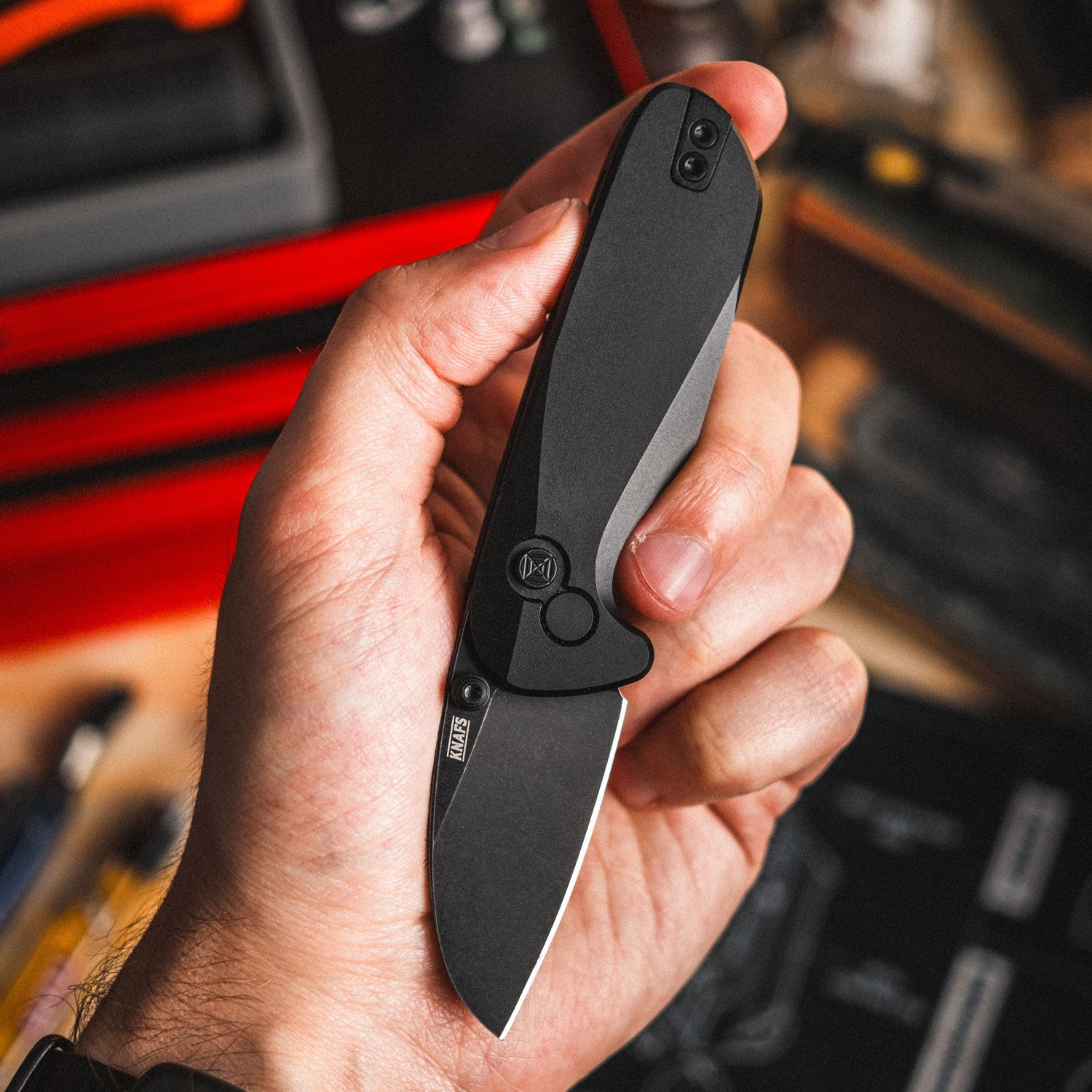 Meet The O.C.T. - Knafs' very first button lock, and if it doesn't look like a typical Knafs design… that's because it isn't. Matt Fitzgerald was tasked with designing a knife that hits the sweet spot of "feels bigger than it looks." The challenge? Keep the blade small but the grip satisfying. Matt gave it the "old college try" (O.C.T.) and under Ben’s mentorship and multiple prototypes, he smashed it.