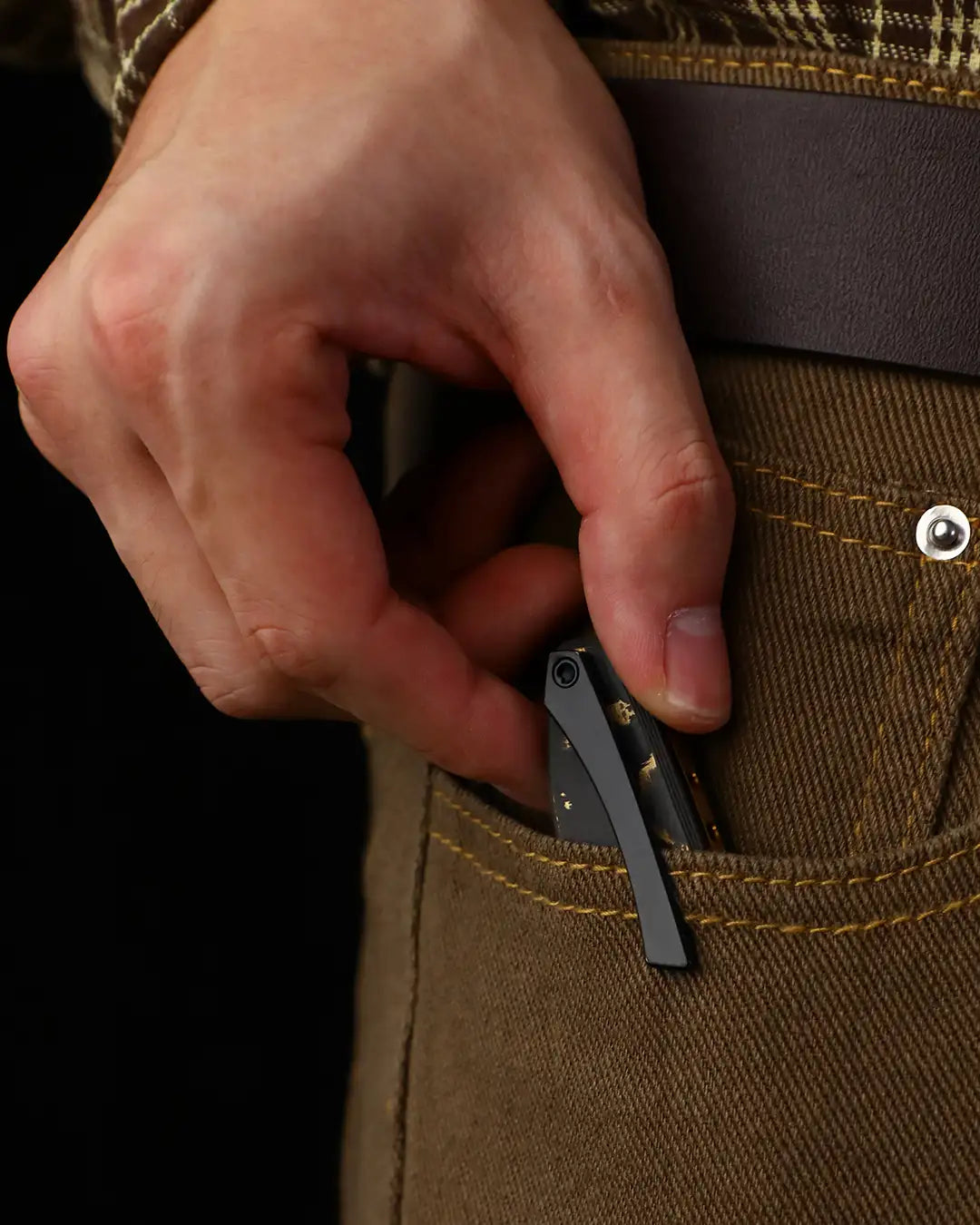 The Shrike by Johan Jordaan is a compact expression of precision and performance. Known for his distinctive designs like the Parakeet and Retro, Jordaan brings his refined sense of proportion and flow to this statement piece. The Shrike’s 2.74" S45VN drop point blade offers exceptional edge retention and slicing control, while the bolstered framelock handles with speedhole backspacer is a nice design touch. Its triple deployment system (thumb stud, thumb hole, and front flipper) delivers fidget-friendly action, making it a joy to use. Lightweight, pocketable, and purpose-built, the Shrike is an everyday companion that punches far above its size.