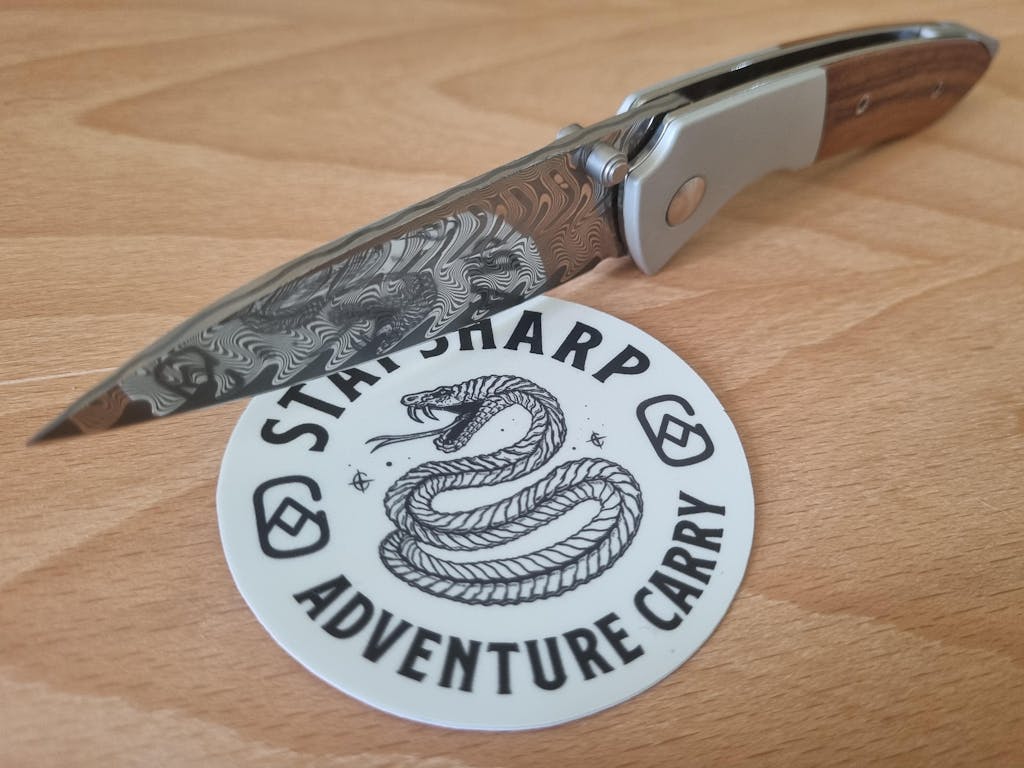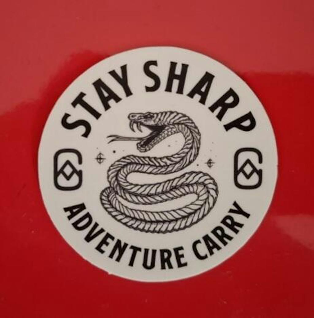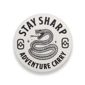 Our Stay Sharp sticker is a slick reminder to keep your wits (and your knives) razor sharp. Featuring our Adventure Carry icon and a coiled snake ready to strike, it’s a nod to awareness, preparedness, and staying sharp always.