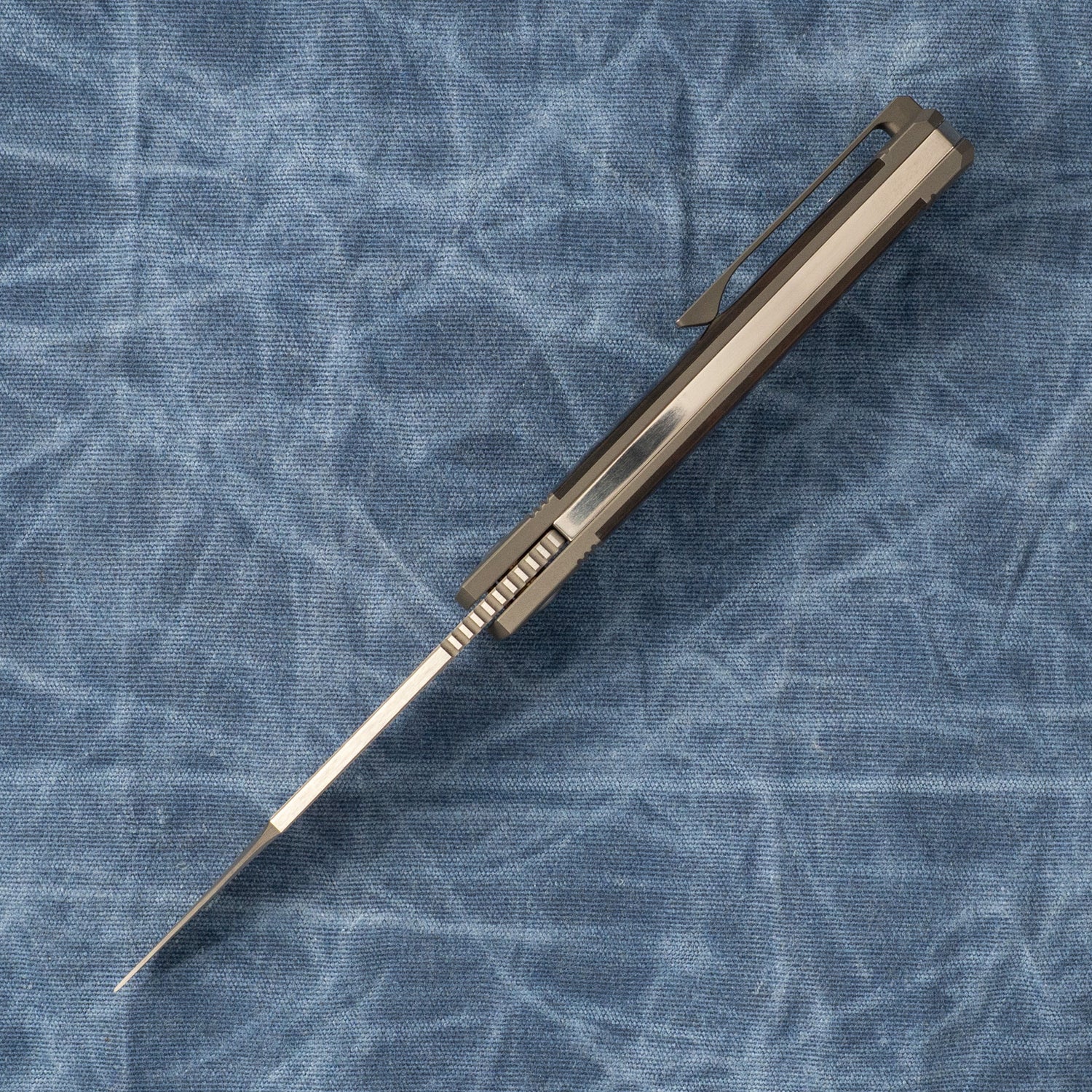 The Gunslinger Jack features a titanium frame lock (bolster lock) construction with specialty inlays. Its slicey hollow ground Crucible S90V blade runs on caged ceramic bearings for exceptional smoothness. A distinctive and well-executed piece, suited for both daily carry and serious collections.