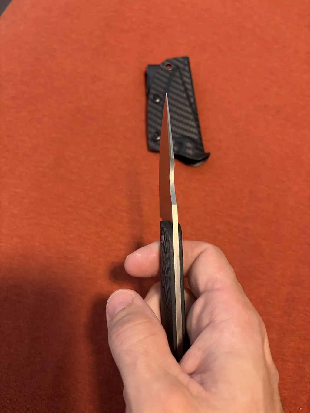 The carbon fibre scales ensures excellent grip and tactile feedback, while the subtly curved blade spine enhances ergonomics and comfort. M390 blade steel for maximum toughness and respectable edge retention. Complete with a kydex sheath and adjustable belt clip.