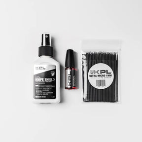 Protect - KPL Knife Shield⢠creates a thin film of corrosion suppressing molecules on metal surfaces. From there the formula interferes with the galvanic corrosion process by shifting corrosion potentials to more noble values, disrupting and preventing the dissolution of metal ions that is key to the chemical processes that create rust and patina.