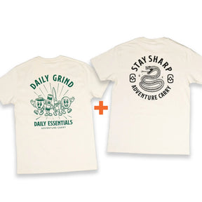 - Artwork: Stay Sharp snake on one tee; Daily Grind mascots (coffee, torch, pocket knife, donut) on the other