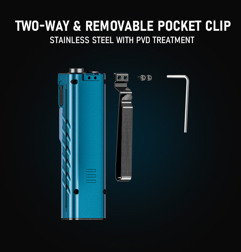 The E60 is a compact, flat EDC flashlight that packs serious performance into a palm-sized package. Featuring a crisp 7000K white beam with up to 1500 lumens of output, a 520nm green laser, and a 365nm UV light, it delivers versatile illumination in a lightweight package. Measuring just 99.9×30.4×14.8mm (excluding clip and sidelight hump) and weighing 94.9g, the E60 offers full functionality without bulk — perfect for everyday carry.