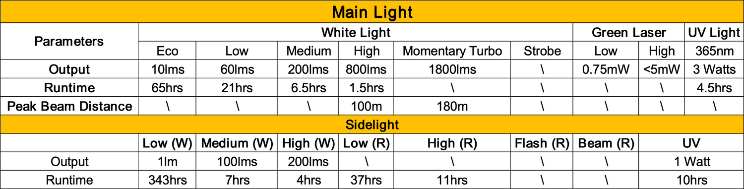 ModesMain Light: Eco, low, med, high, turbo, strobe, UV (365nm/3 Watts), Green Laser (0.75mW)., Side Light: Low, med, high, red (low), red (high), red (flash), red (beam) UV (1 Watt)