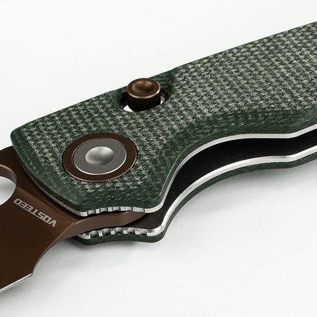 The Vosteed Psyop, designed with Geoff Blauvelt (TuffKnives), returns in a more accessible form—now sporting green Norplex UltreX™ Micarta scales for a grippy, comfortable feel with serious character. Its 3.32" Elmax blade delivers excellent edge retention and corrosion resistance, while the button-operated top liner lock provides intuitive, fidget-friendly action. Smooth on ceramic bearings with both front flipper and thumbhole deployment, the Psyop is a refined workhorse built to perform and built to last.